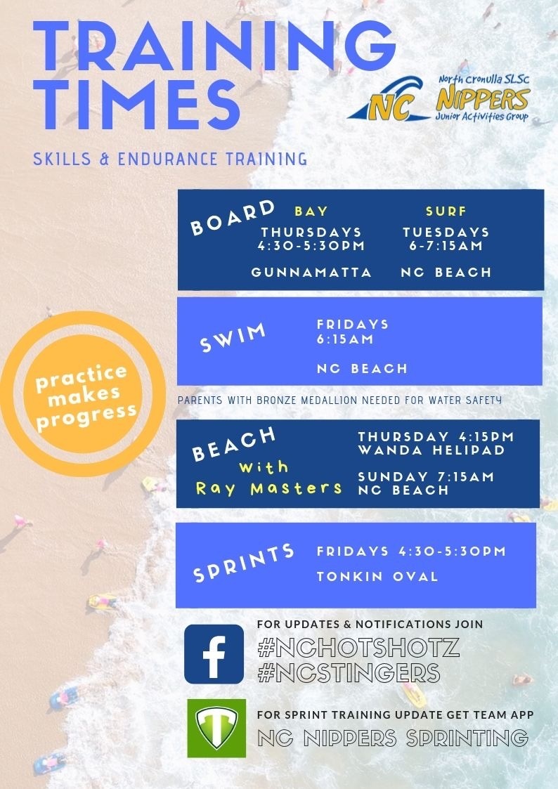 There are a number of training sessions that take place during the week for board, swim, sprint flags, R&R and march past. Please join North Cronulla Nippers TeamApp to stay up to date.