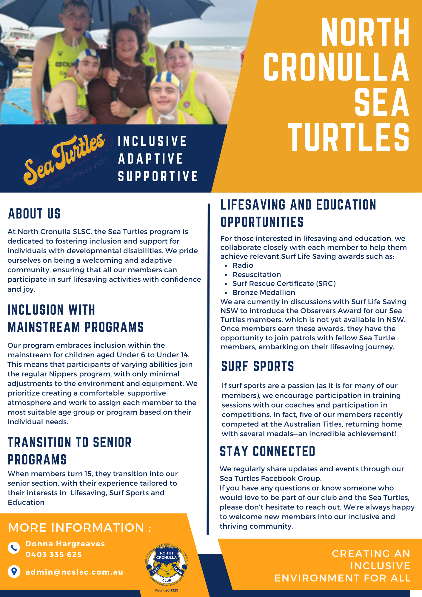 - Inclusive Program: The Sea Turtles provide life-saving and surf sport opportunities for members with different abilities in a supportive and empowering environment.